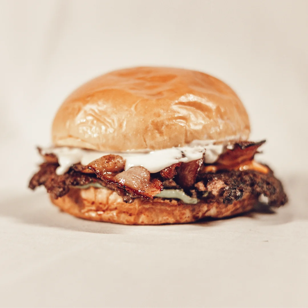 Pão brioche tostado, escolha o número de hambúrgueres, queijo cheddar, bacon e a maionese de bacon da casa.