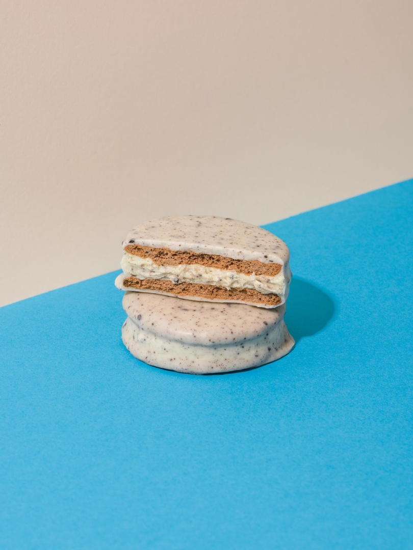Alfajor crocante com recheio sabor chocolate branco e cobertura sabor chocolate branco com biscoitos triturados.